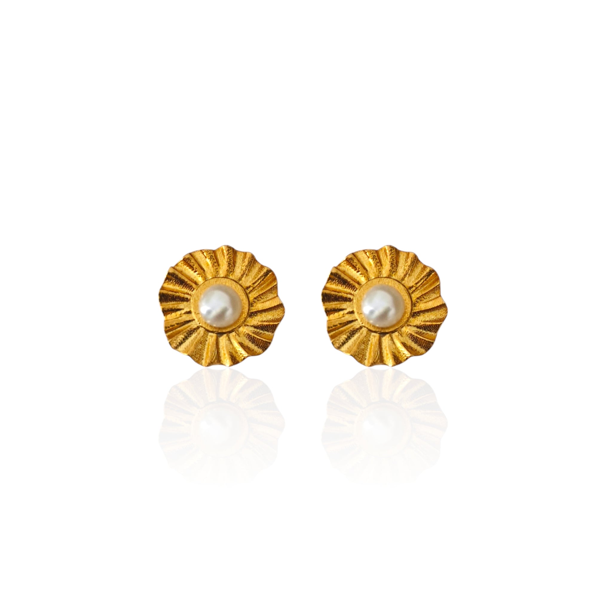A small sun, carved in rays, holding a quiet pearl at its center.These studs are made to glow without shouting: a warm, ancient kind of gold, and a soft moon-like point of light that follows you from morning to night.