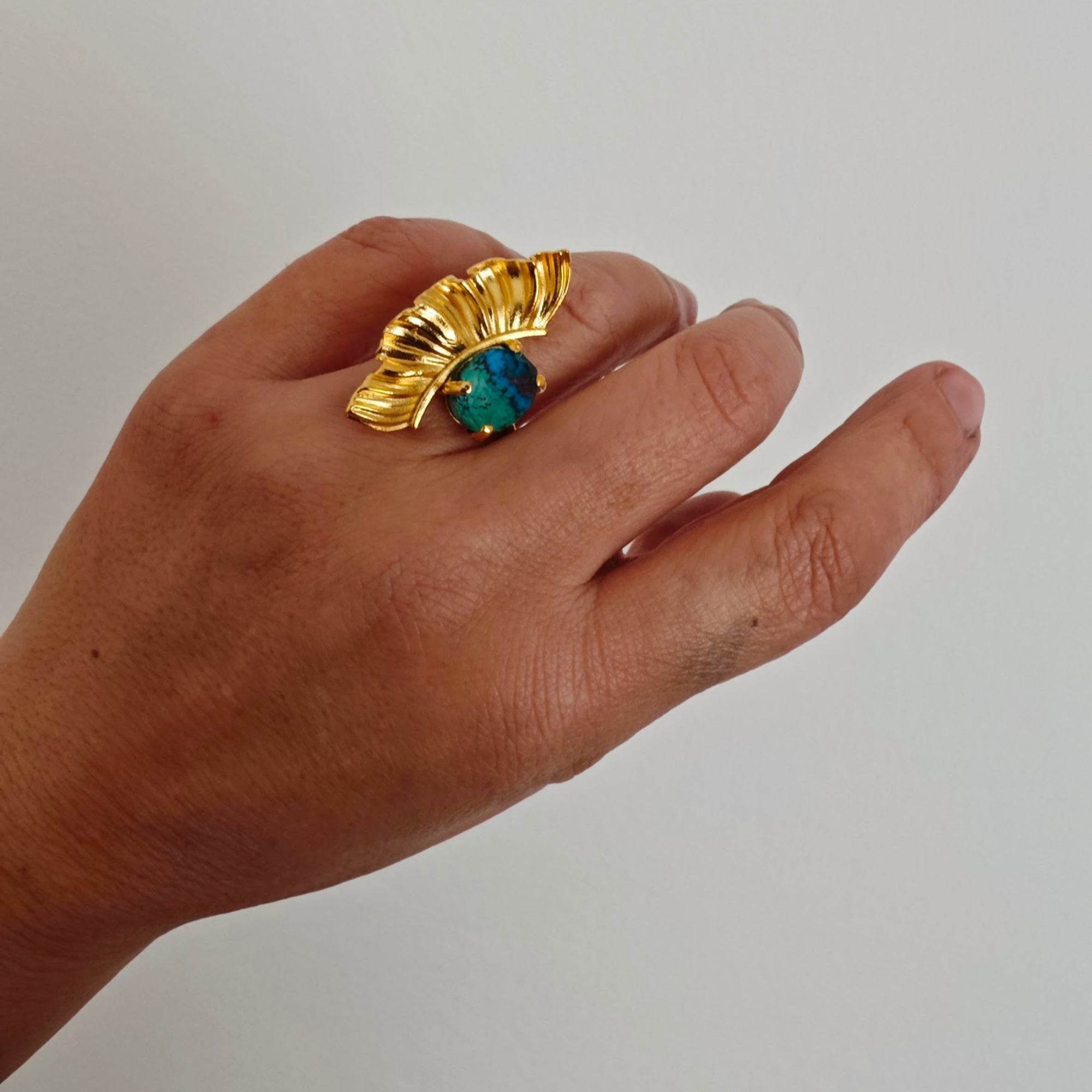 Let your fingers speak the language of myth. The Argus adjustable ring is a bold sculptural creation, crowned with a Double Chyrsocolla  stone. Inspired by celestial wings and ancient guardians, its sweeping curves wrap around the finger like a whisper from another world.
