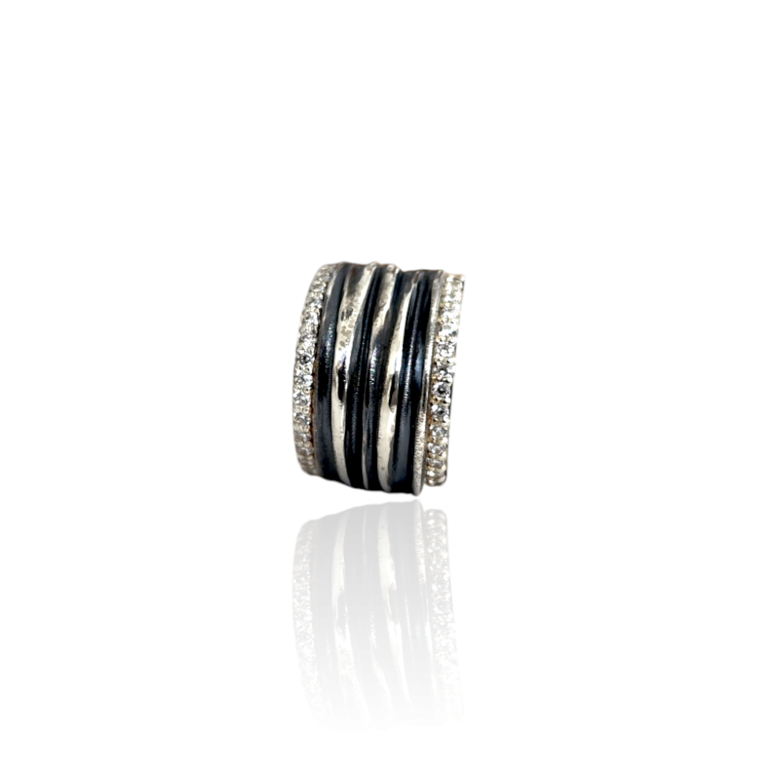 The Athenais Hemera Ring reflects the eternal dance of day and night. Inspired by ancient Greek garment folds, its wide band is framed by radiant lines of black or white zircons, symbolizing shadow and light. Available in four unique finishes — all oxidized, partly oxidized, silver, and gold plated — it adapts to every story, every mood.