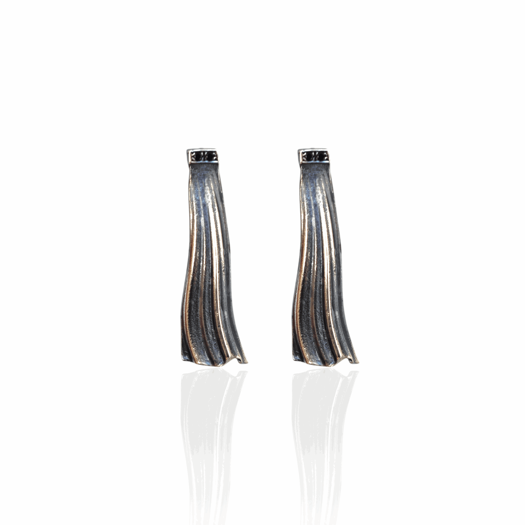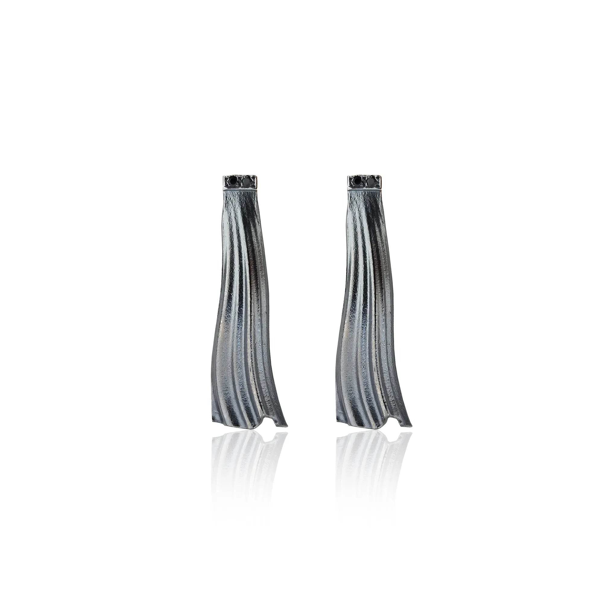 Inspired by Dione, the divine oracle of the ancient sanctuary, these sculpted earrings speak in flowing lines and quiet strength. The Dione II Earrings feature a soft pleated silhouette reminiscent of draped garments and timeless movement. Crowned with black zircons, they shimmer with a mysterious elegance.