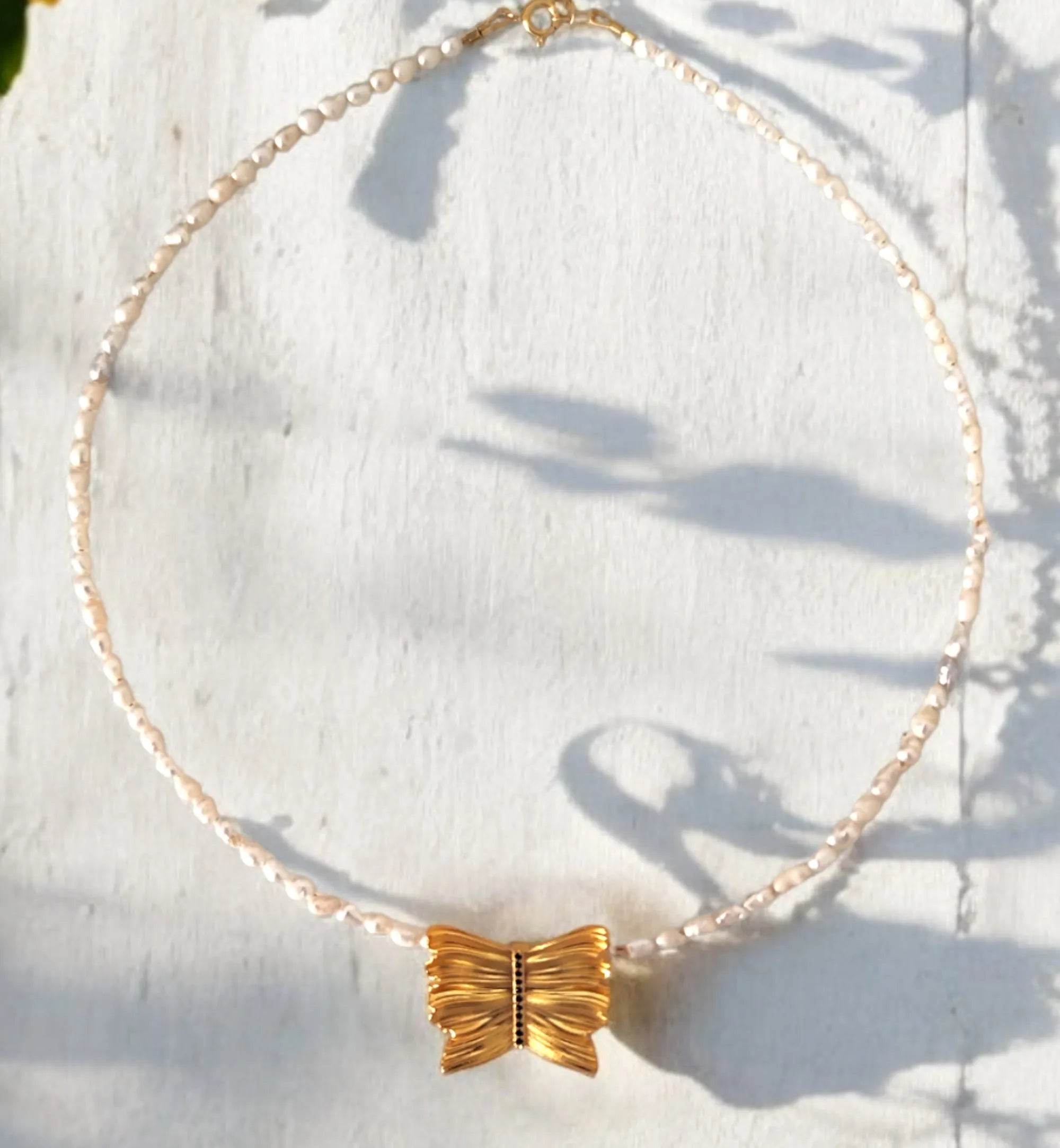 A sculptural statement suspended in silence — this necklace pairs luminous freshwater pearls with a golden charm that evokes the folds of ancient fabric, delicately pleated like a whispered secret. Inspired by the timeless drapery of the Peplos, this butterfly-like form becomes a symbol of transformation, elegance, and feminine energy. Handcrafted in detail, it is not merely a necklace — it’s a fragment of myth worn close to the heart.
