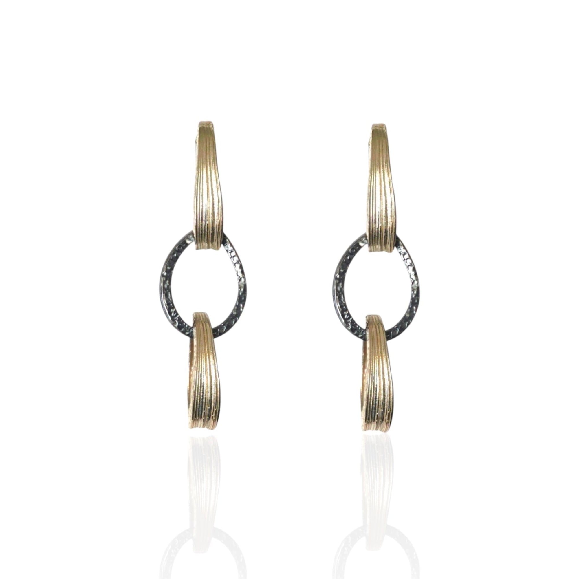 Two arcs of light. One oval shadow. Orbit Link Earrings move with a quiet rhythm like a small constellation you wear. The folded, ribbed surfaces catch the sun,  the oxidized oval holds the contrast, grounding the shine in depth. Minimal, architectural, & handmade, designed to elevate an everyday look or finish an evening silhouette with ease.