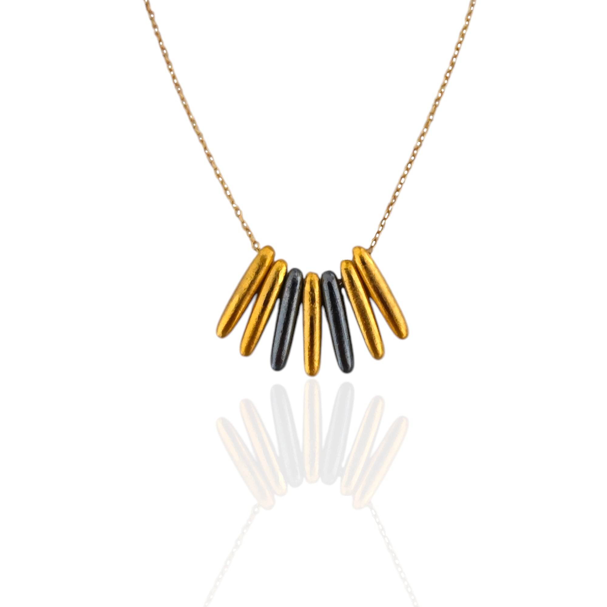 Bold yet elegant, this necklace features a rhythmic harmony of elongated oval charms in radiant gold and deep oxidized silver. Each charm is sculpted with a smooth, organic curve, evoking ancient forms reimagined with a modern spirit.