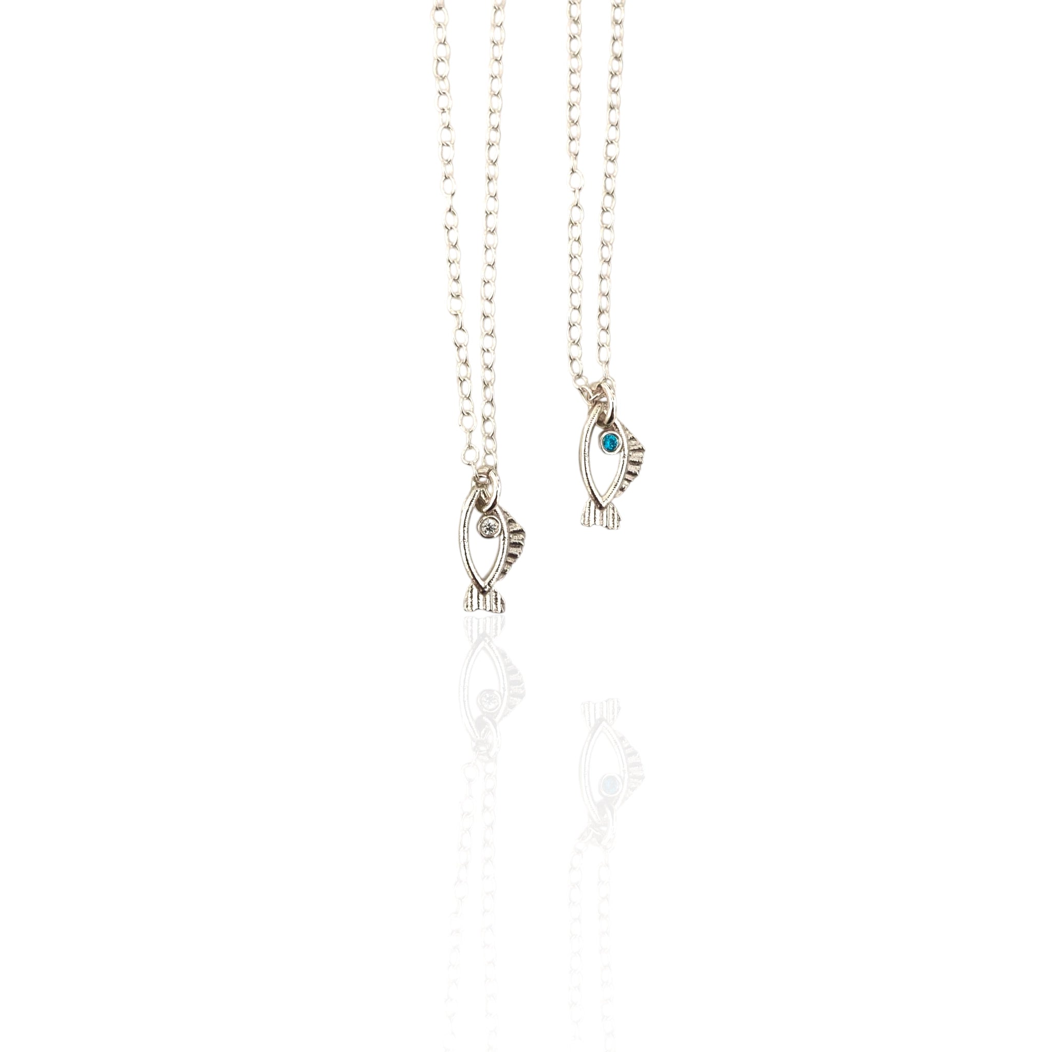 A small fish-shaped pendant, hand-finished in silver, silver gold plated, or silver all black oxidized, carrying a single zircon like a glimmering eye of light. Delicate yet full of character, Galene feels like a quiet little charm washed ashore from a hidden story of the sea.