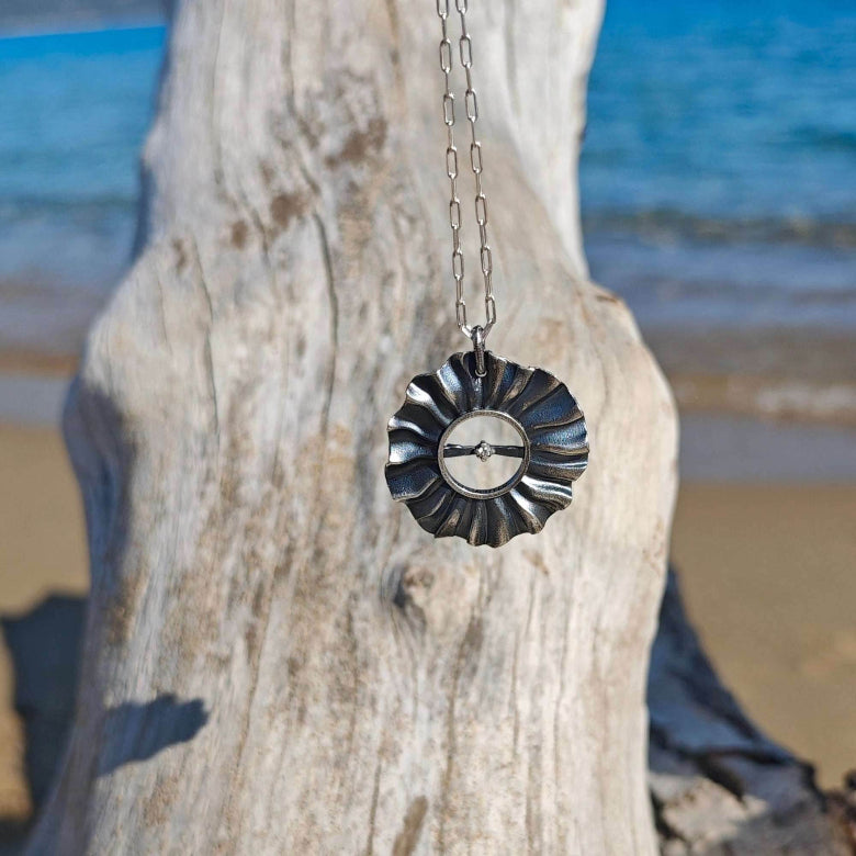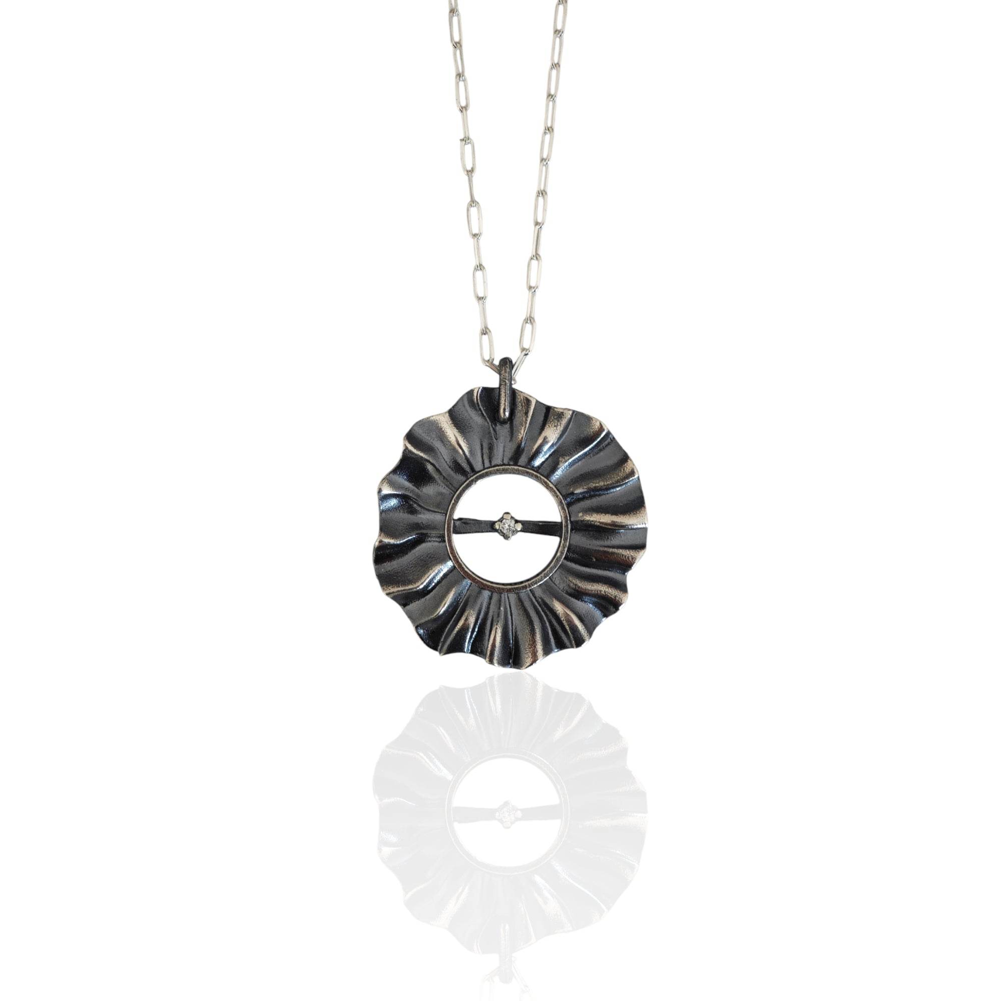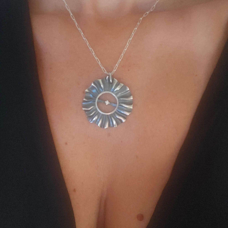 The Helios Pendant radiates timeless strength and mystery, inspired by the eternal power of the sun. Its rippling folds echo the movement of light across the sky, while a central zircon shines as the heart of its orbit. A bold statement piece, yet refined in detail, it brings harmony between cosmic symbolism and contemporary design.