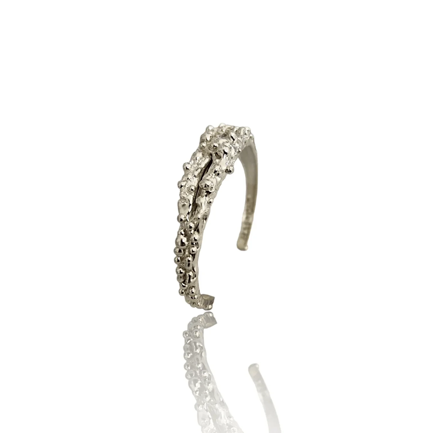 This stunning silver cuff bracelet features intricately crafted little and big balls that resemble the rugged textures of rocks, evoking a sense of organic elegance and sophistication.