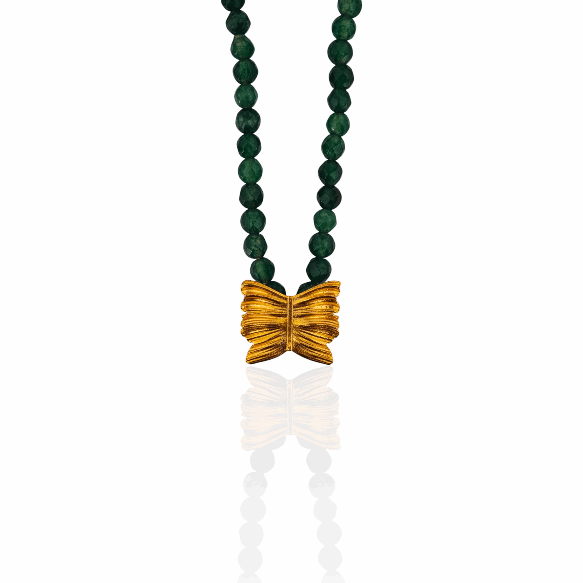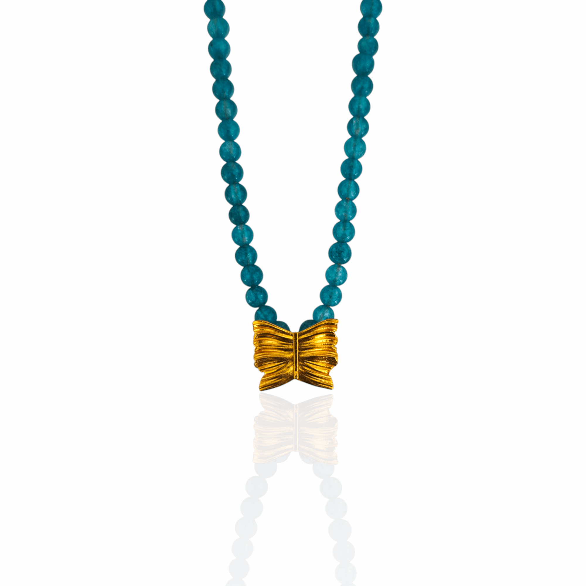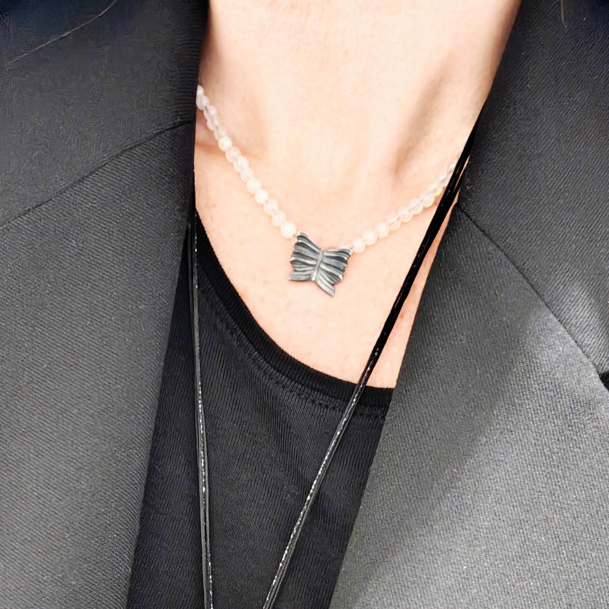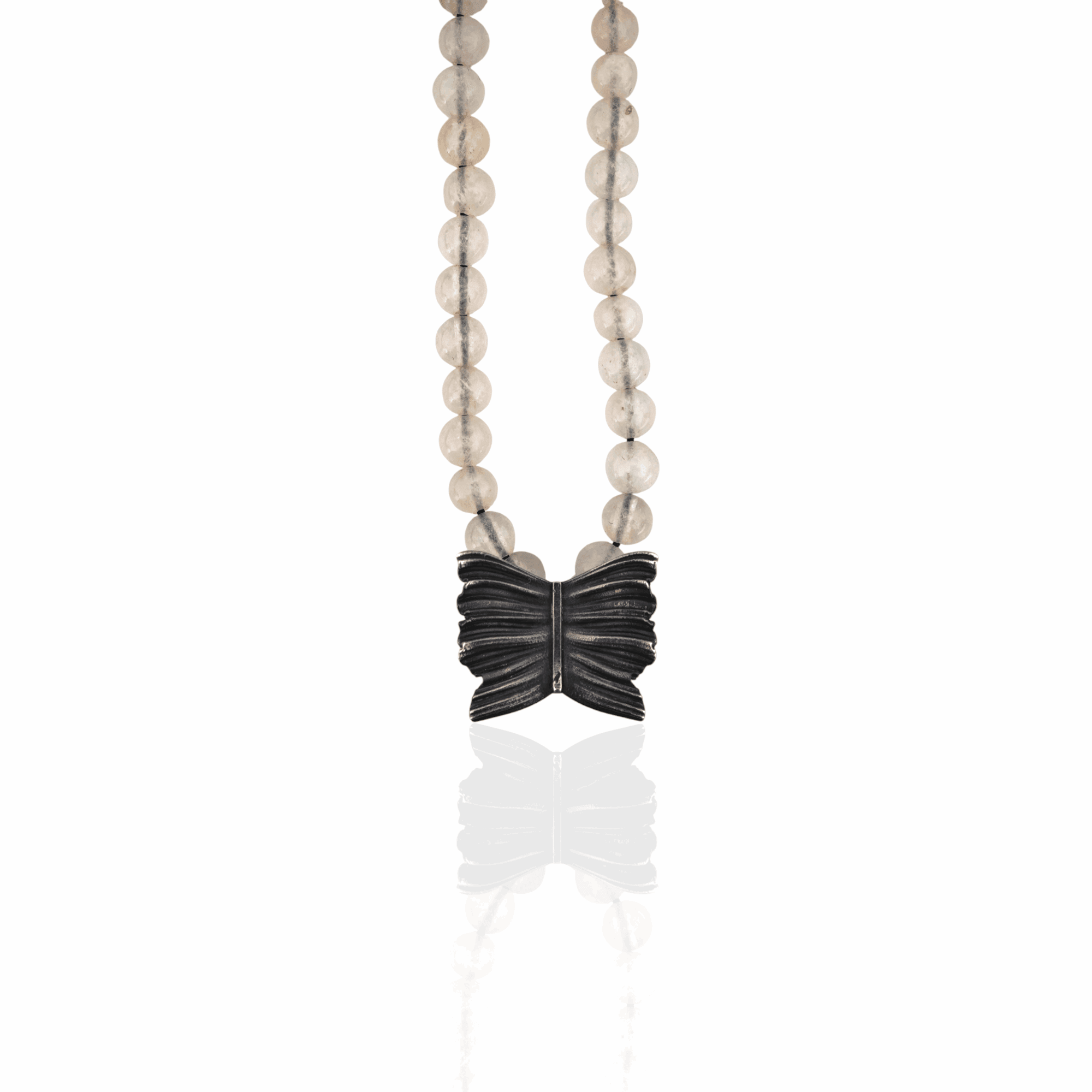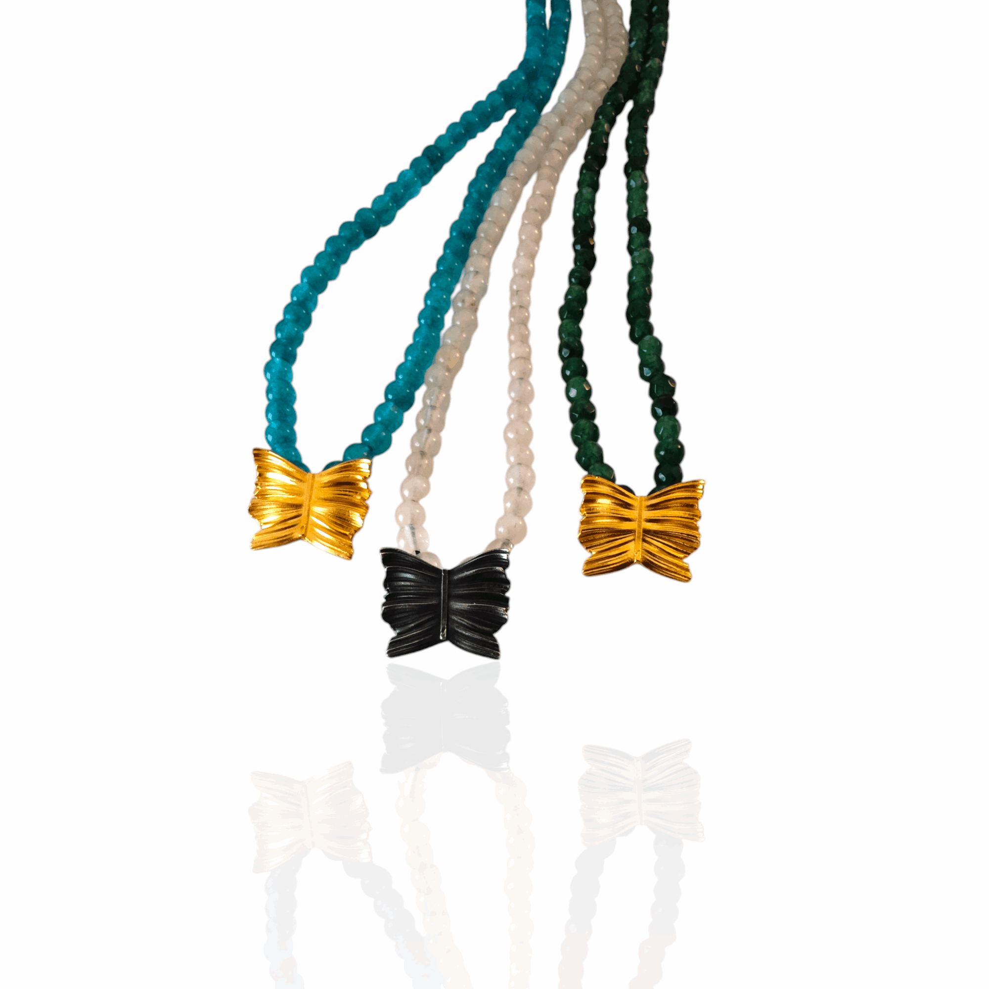 Chrysalis is a tribute to the eternal moment before becoming—before flight, before bloom. This handcrafted necklace features a sculptural butterfly charm in 925 silver, offered in oxidized or gold-plated finishes. It rests delicately at the center of a 40 cm strand of jade beads, available in six soul-soaked shades: rose, light brown, white, yellow, green, and turquoise.