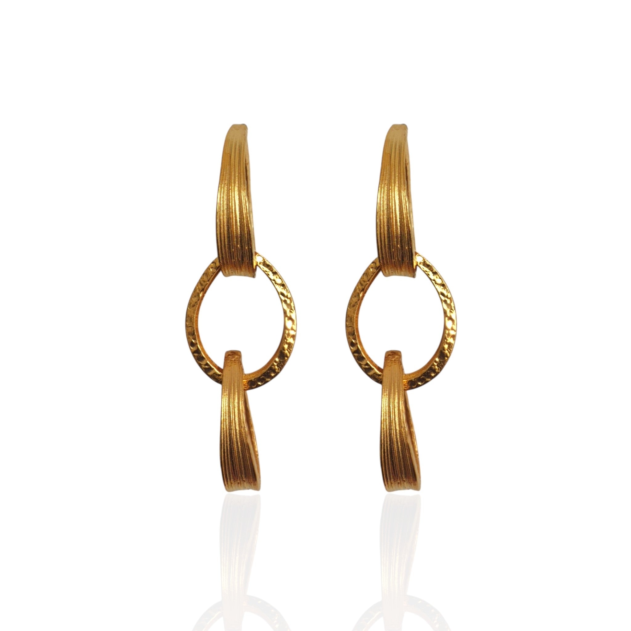 Two arcs of light. One oval shadow. Orbit Link Earrings move with a quiet rhythm like a small constellation you wear. The folded, ribbed surfaces catch the sun, the oxidized oval holds the contrast, grounding the shine in depth. Minimal, architectural, & handmade, designed to elevate an everyday look or finish an evening silhouette with ease.