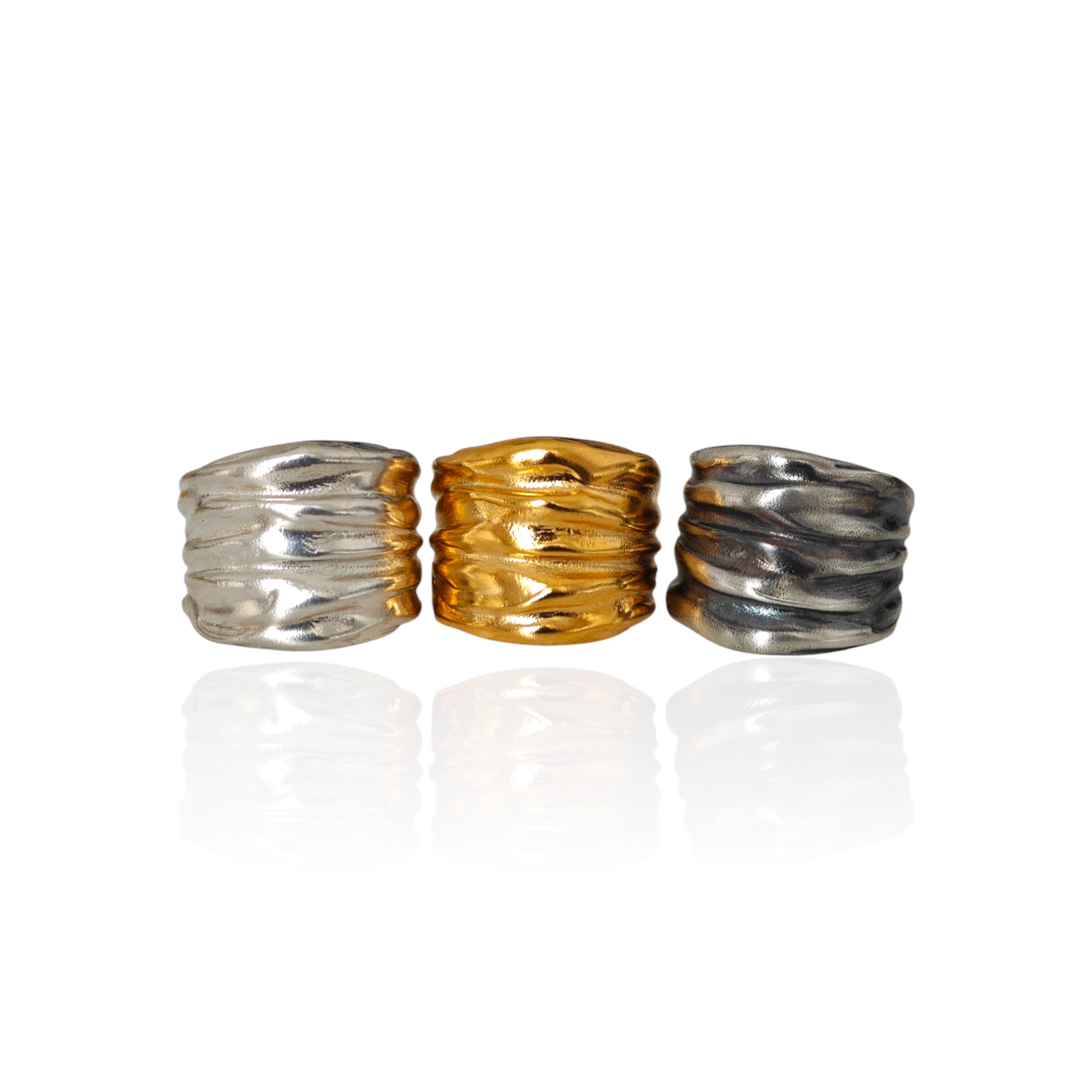 A wide band shaped like draped fabric, soft in movement, strong in presence, crafted to feel like an ancient fragment you found by the sea and never took off again.