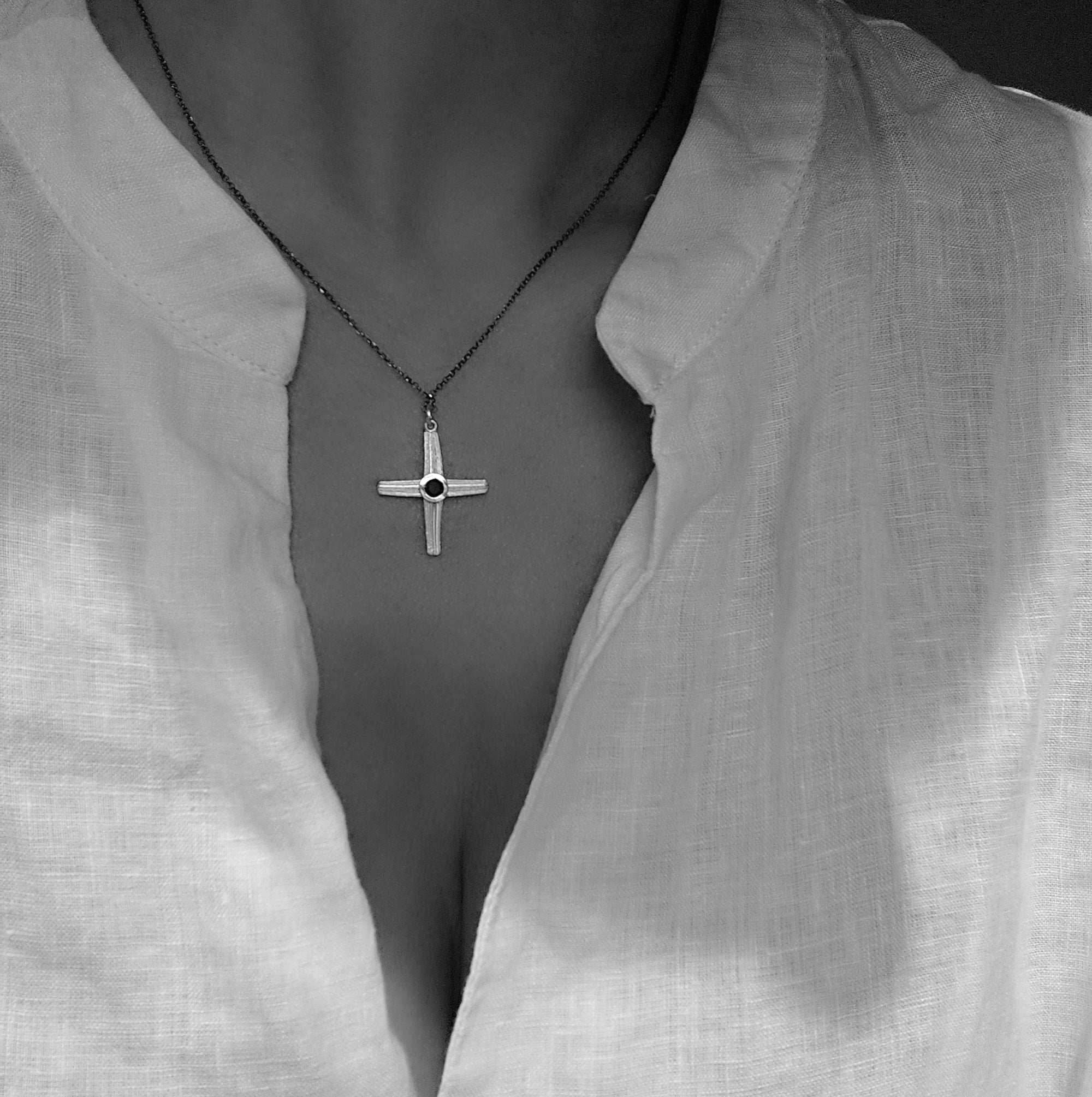 Handcrafted in sterling silver, the Fýssa Cross is available in three sacred finishes: