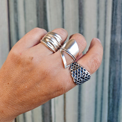 Crafted in silver with an oxidized detail line dividing the open triangle from the solid base, this piece hugs the finger like a sculptural embrace. Made to be worn solo or in a stacked expression of strength.