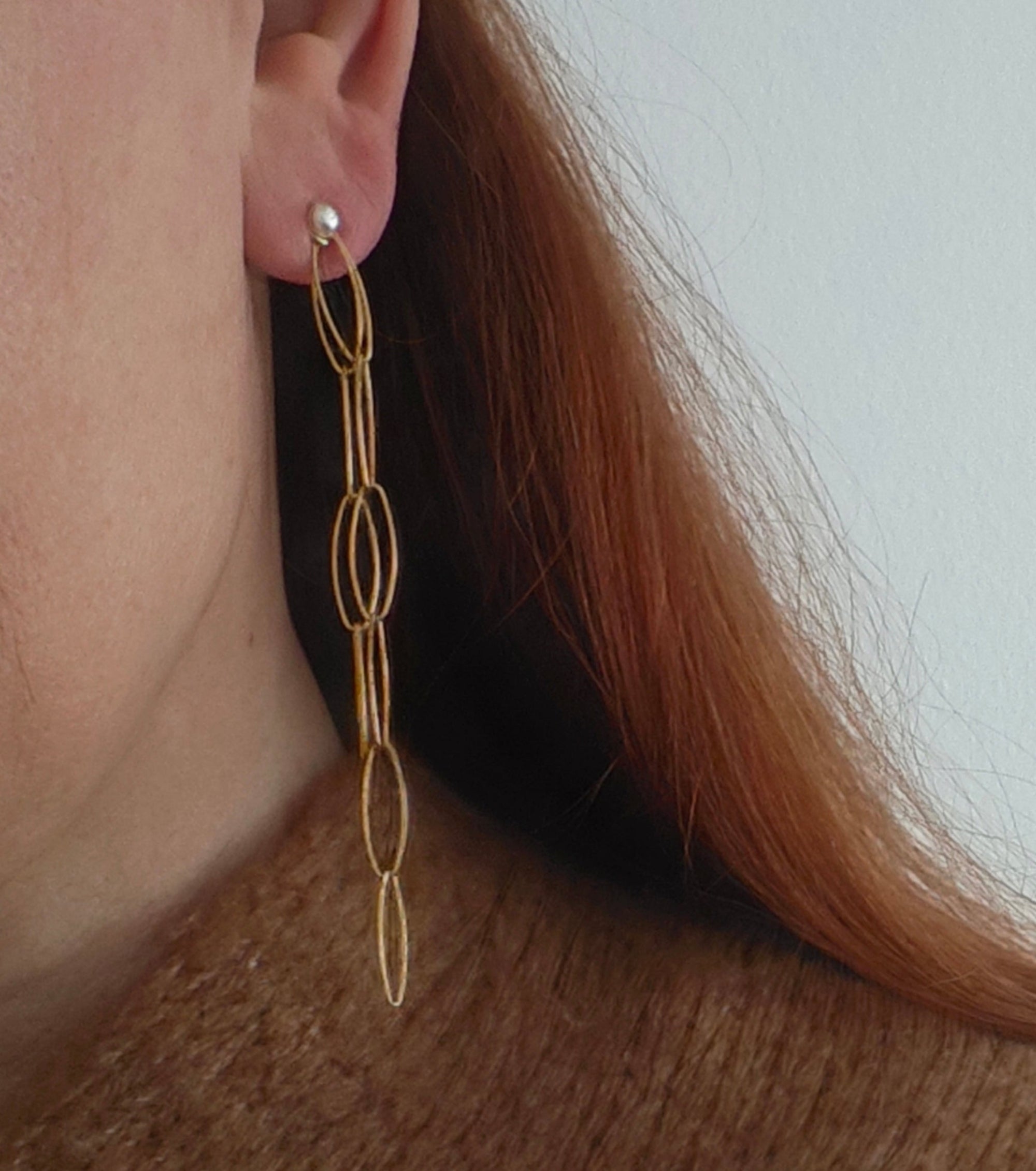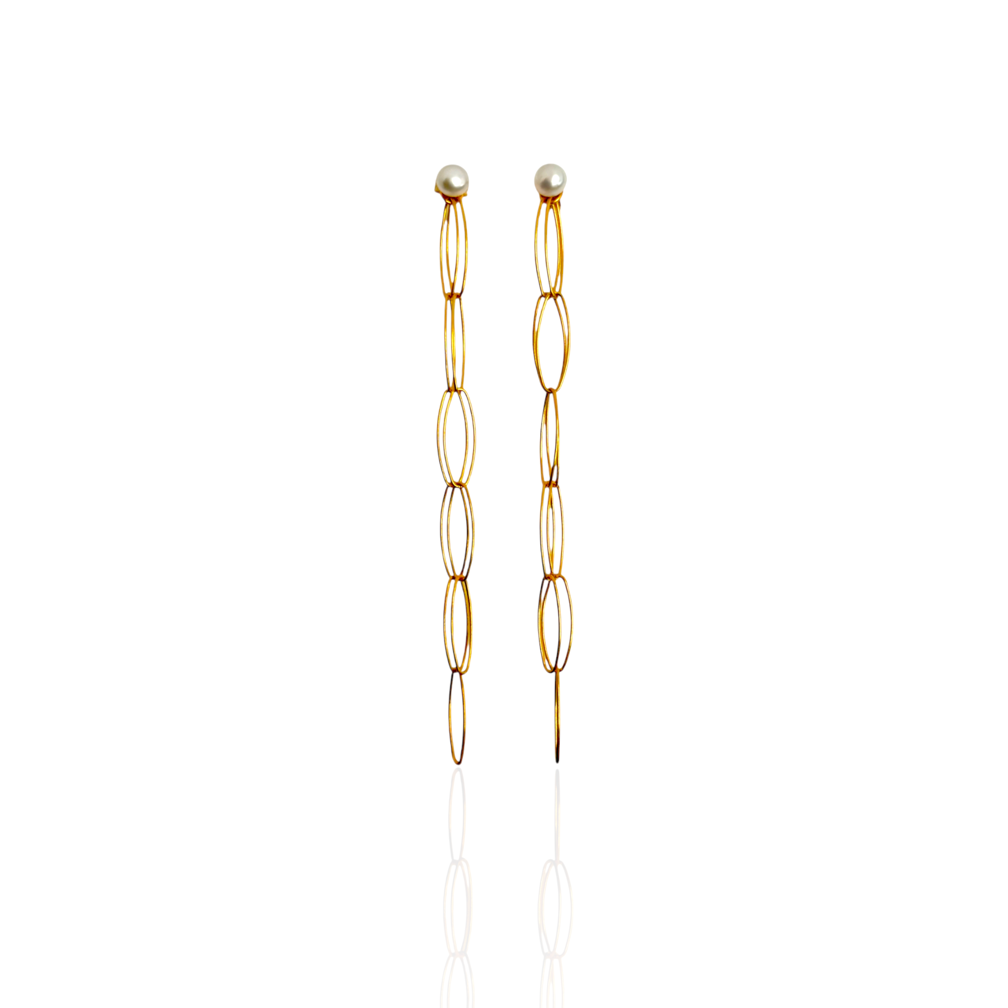 These earrings belong to Geometries, a study of balance where the oval repeats like a quiet mantra. A luminous pearl sits at the ear, then the chain of ovals falls with clean symmetry, catching light with every step.