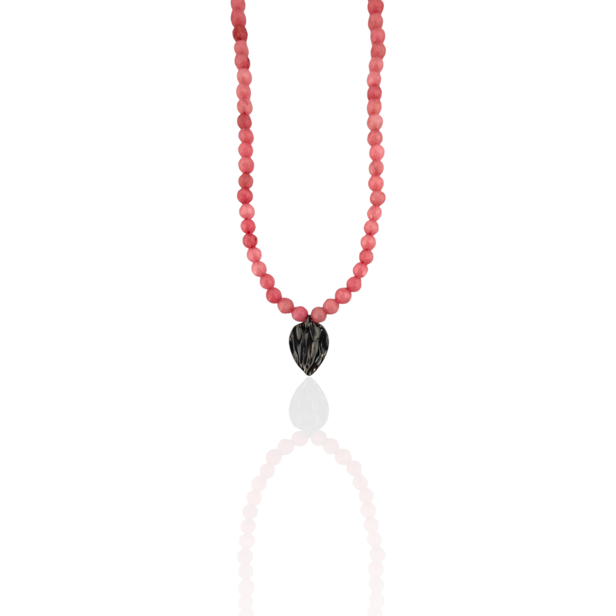 A strand of soft rose jade, like dawn light turned into beads, finished with a small Peplos drop at the center: a tiny fold of metal, shaped like draped cloth and worn close to the heart.