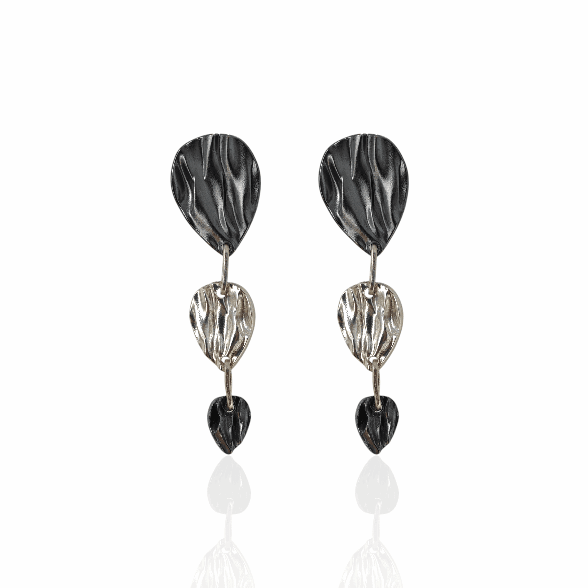 Sculptural and fluid, these statement earrings are composed of three organically shaped elements—each one textured with rhythmic, wavy folds that mimic flowing fabric. The contrast between oxidized silver and gold-plated brass creates a striking harmony, while the elongated form gently elongates the neck. A poetic composition of motion, shadow, and light.